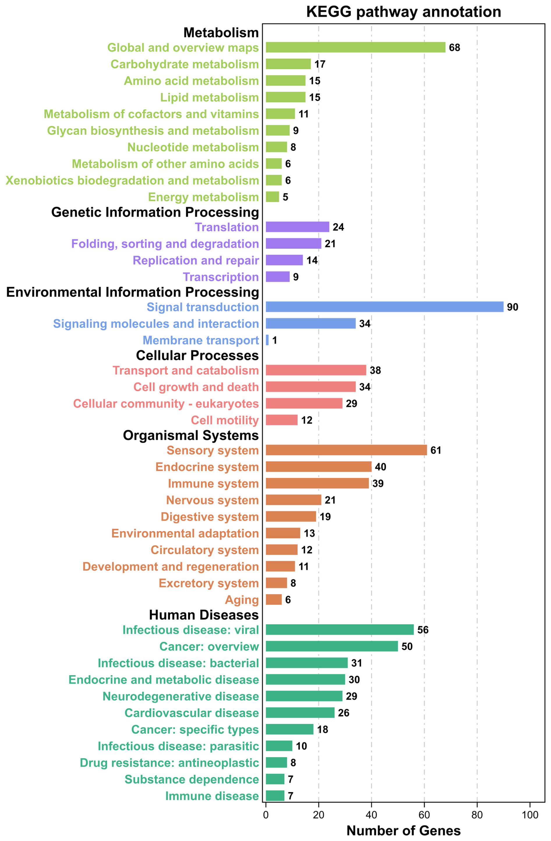 Figure 4KEGG pathway annotation of candidate genes located in Danish LW pig ROH islands. KEGG=Kyoto Encyclopedia of Genes and Genomes; LW=Large White; ROH=runs of homozygosity.