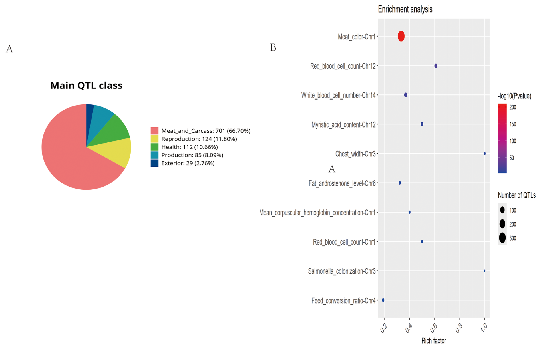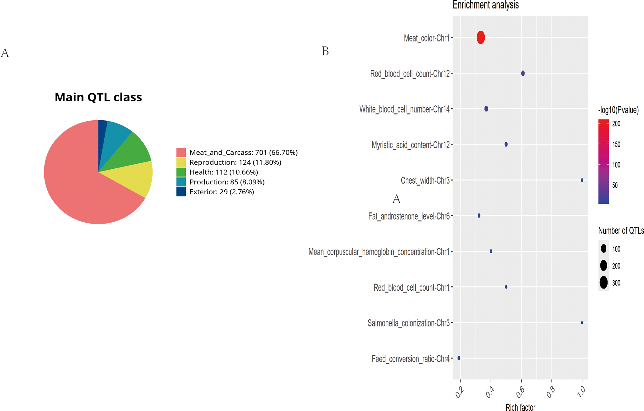 Figure 5Summary of trait-associated QTLs mapped to ROH islands in Danish LW pigs. (A) Trait-based classification of annotated QTLs. (B) Significantly enriched QTLs displayed in a bubble plot format (false discovery rate-adjusted p value < 0.05). QTL=quantitative trait locus; ROH=runs of homozygosity; LW=Large White.