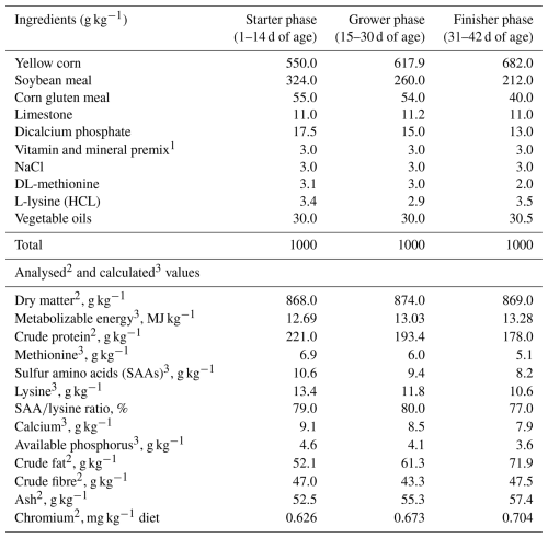 A total of 245 Cobb500 broiler chicks (1 d old, both sexes) were wing-banded and randomly distributed based on similar initial body weight in a completely randomized design with seven treatments, each including seven replicates of five chicks. The sample size was chosen for logistical management reasons while maintaining an adequate number of replicates to obtain statistical power and minimize the effect of chance on the results. The choice of seven treatments reflects the desire to examine both the response to the presence or absence of chromium and the effects of specific concentrations of each source as efficiently as possible. The inclusion of a chromium-unsupplemented control group allows for a clear comparison with the organic and inorganic chromium treatments while maintaining the power of the experiment with a simple design. This approach allows us to isolate the main effect of different chromium concentrations and answer our hypothesis. Each replicate was maintained in a battery brooder (metal cage) with a size of 35 cm × 25 cm × 30 cm (L × W × H). The negative control group was fed a basal diet without Cr supplementation. In the six other groups, chicks were fed the same basal diet supplemented with 100, 200, and 400 ppb of organic (Cr picolinate, C18H12N3O6Cr; Nowfoods.com, made in Canada and quality tested in Bloomingdale, IL, USA) and inorganic Cr (Cr chloride, CrCl3; Muby Chemicals of the Mubychem Group, Mubychem, western India). The Cr content of the diets was determined using a Varian 720-ES ICP–optical emission spectrometer (ICP-OES), as described by Olajire and Ayodele (1997). The level of both organic and inorganic chromium was chosen based on a review of the scientific literature and the indications of the producers. Previous studies indicate not only that organic chromium, such as picolinate, tends to have a higher absorbability under standard conditions, but also that inorganic chromium chloride can positively affect growth performance at optimal levels under stress conditions (Jain et al., 2018; Arif et al., 2019). The responses to chromium supplements may vary greatly depending on the environmental context and the specific needs of each organism under stress. The ingredients and chemical composition of the basal starter, grower, and finisher diets are presented in Table 1. Chromium was mixed directly into the chicken diet at the concentrations indicated. Chromium sources were first premixed using a blender with a small amount of the basal diet to obtain a homogeneous micro-premix, which was then incorporated into the complete mash diet using mechanical mixing. The homogeneity of chromium distribution was verified by ICP-OES analysis of the final diets. Although pelleting can further improve homogeneity, mash diets are commonly used in experimental trials to avoid heat-induced degradation of organic chromium forms. During 1–24 d of age, the birds were kept under the same temperature conditions (32, 30, and 28 °C during the first, second, and third week, respectively). The chickens were housed in a semi-open room. Then, during 25–42 d of age, birds were kept for 3 successive days (Monday, Tuesday, and Wednesday) weekly at 36 ± 2 °C and 75 %–85 % relative humidity from 10:00 to 17:00. All experimental groups, including the control group, were exposed to the same heat stress conditions; therefore, the control birds represent heat-stressed broilers fed a basal diet without chromium supplementation. When not exposed to heat, the birds were kept under thermoneutral conditions (25 ± 2 °C). During the entire experimental period, the chicks were kept under similar managerial and hygienic conditions. Chickens were provided with a 23:1 daily light:dark cycle during the experimental period. Chickens were fed corn–soybean meal mash diets during days 1–14 d (starter diet), 15–30 d (grower diet), and 31–42 d (finisher diet) of age. The ingredient and chemical composition of the experimental diets are reported in Table 1.