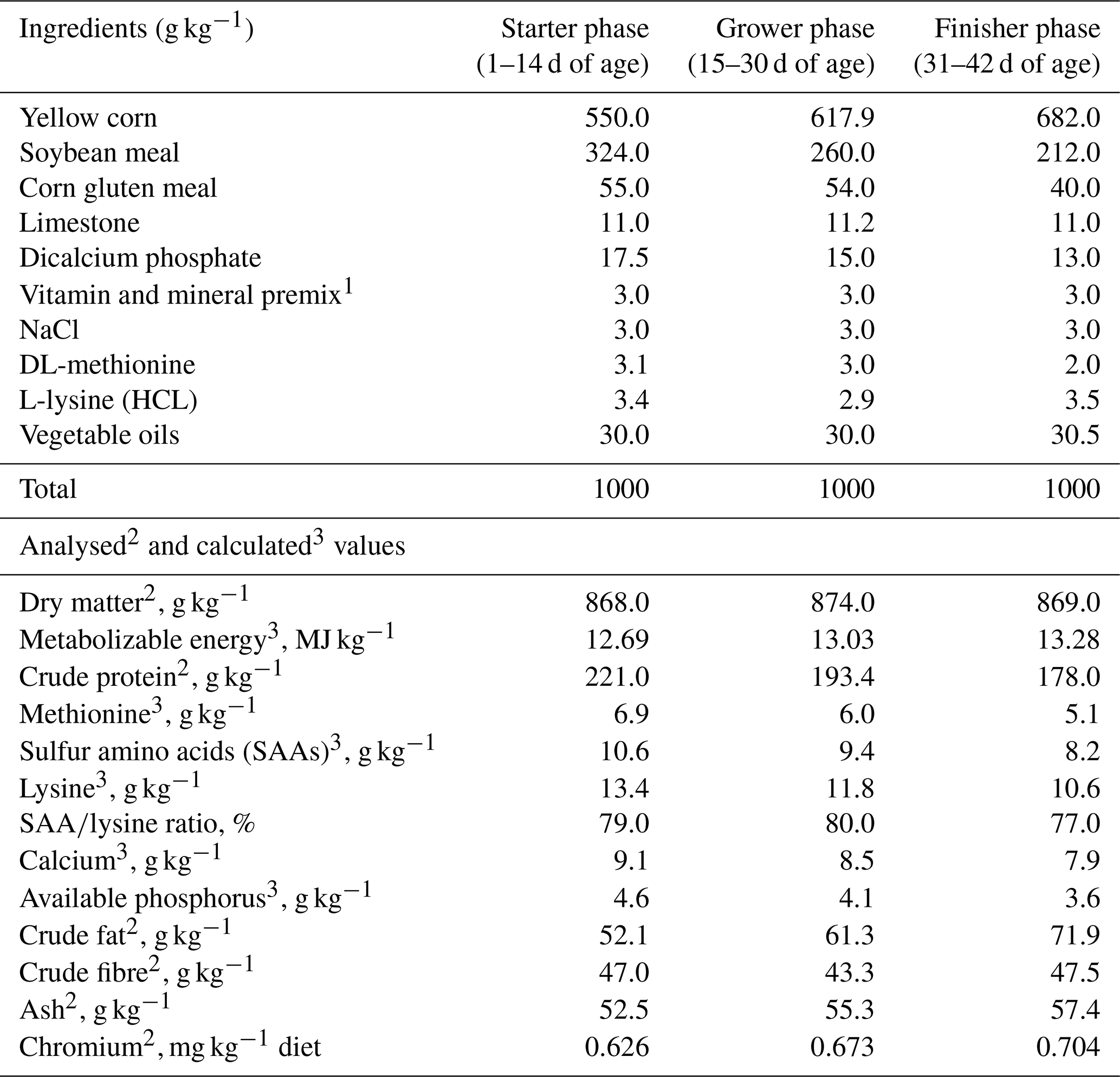 1 Per kilogram of diet: vitamin A, 24 mg; vitamin E, 20 mg; menadione, 2.3 mg; vitamin D3, 0.05 mg; riboflavin, 5.5 mg; calcium pantothenate, 12 mg; nicotinic acid, 50 mg; choline chloride, 600 mg; vitamin B12, 10 µg; vitamin B6, 3 mg; thiamine, 3 mg; folic acid, 1 mg; d-biotin, 0.05 mg; Mn, 80 mg kg−1; Zn, 60 mg kg−1; Fe, 35 mg kg−1; Cu, 8 mg kg−1; Se, 0.60 mg kg−1. 2 Analysed values: dry matter, crude protein, crude fat (ether extract), crude fibre, and ash were determined according to AOAC (1995). Chromium content of the diets was determined by ICP-OES (Varian 720-ES) as described by Olajire and Ayodele (1997); chromium distribution homogeneity was verified by ICP-OES analysis of the final diets. 3 Calculated values: metabolizable energy, amino acids (methionine, sulfur amino acids, and lysine), calcium, and available phosphorus were calculated based on ingredient composition and NRC (1994) nutrient tables/recommendations.