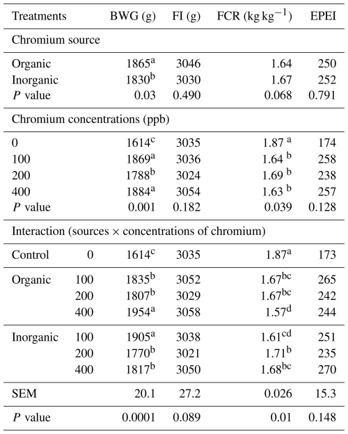 Means in a column under similar treatment conditions not sharing the same superscript are significantly different (P<0.05). SEM – pooled standard error of the mean. BWG – body weight gain. FI – feed intake. FCR – feed conversion ratio. EPEI – European Production Efficiency Index. The control (0 ppb supplemented Cr) is shown for comparison; the source × level interaction refers to chromium-supplemented treatments only (100–400 ppb). The 0 ppb supplemented Cr control was compared with the chromium-supplemented treatments by planned contrasts within the GLM analysis.