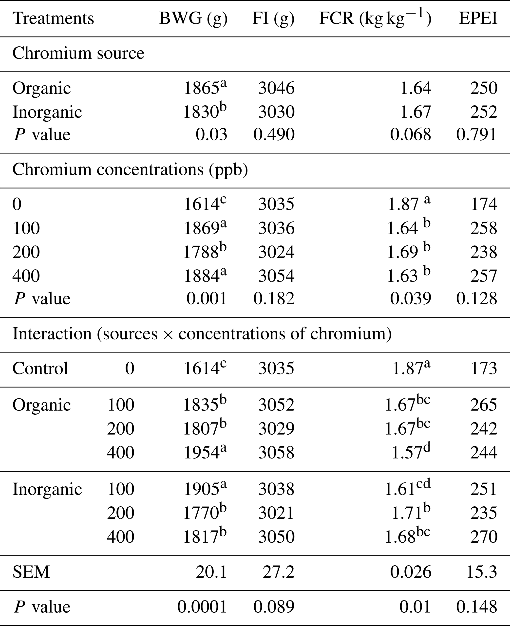 There was no significant effect of Cr source on FI, FCR, and EPEI or of Cr levels on FI and EPEI. Within the chromium-supplemented treatments (organic vs. inorganic at 100–400 ppb), the source × level interaction affected BWG (P<0.0001) and FCR (P<0.01) (Table 2).