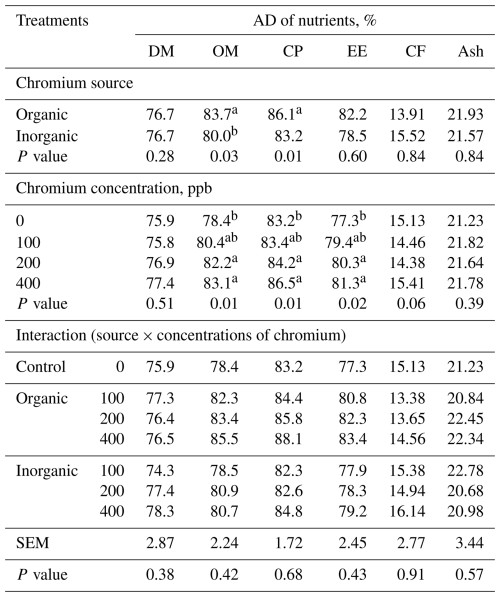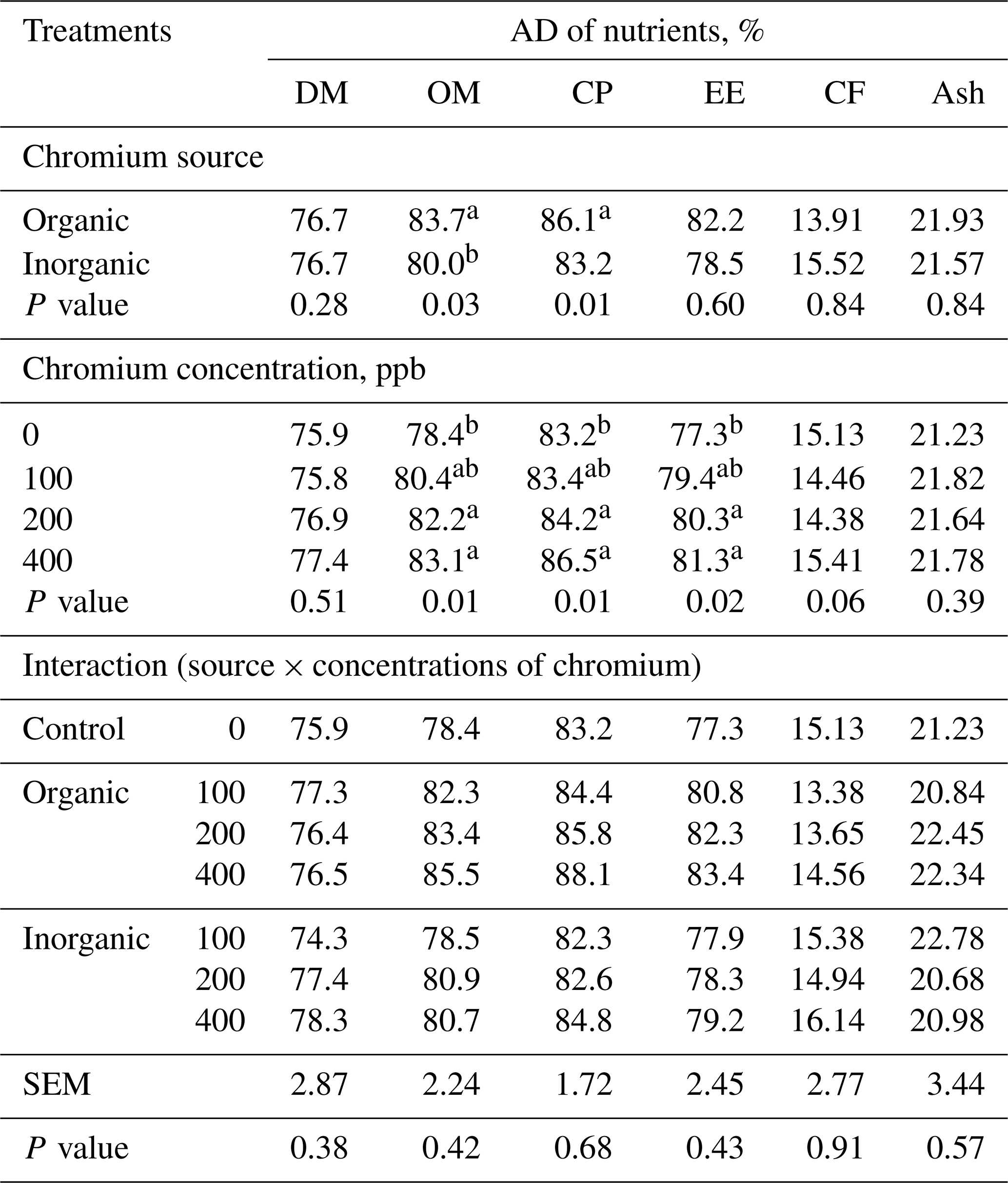 a,b Means in a column under similar treatment conditions not sharing the same superscript are significantly different at 5 %. SEM – pooled standard error of the mean. DM – dry matter, OM – organic matter, CP – crude protein, EE – ether extract, CF – crude fibre. The control (0 ppb supplemented Cr) is shown for comparison; the source × concentration interaction refers to chromium-supplemented treatments only (100–400 ppb).