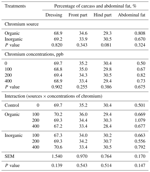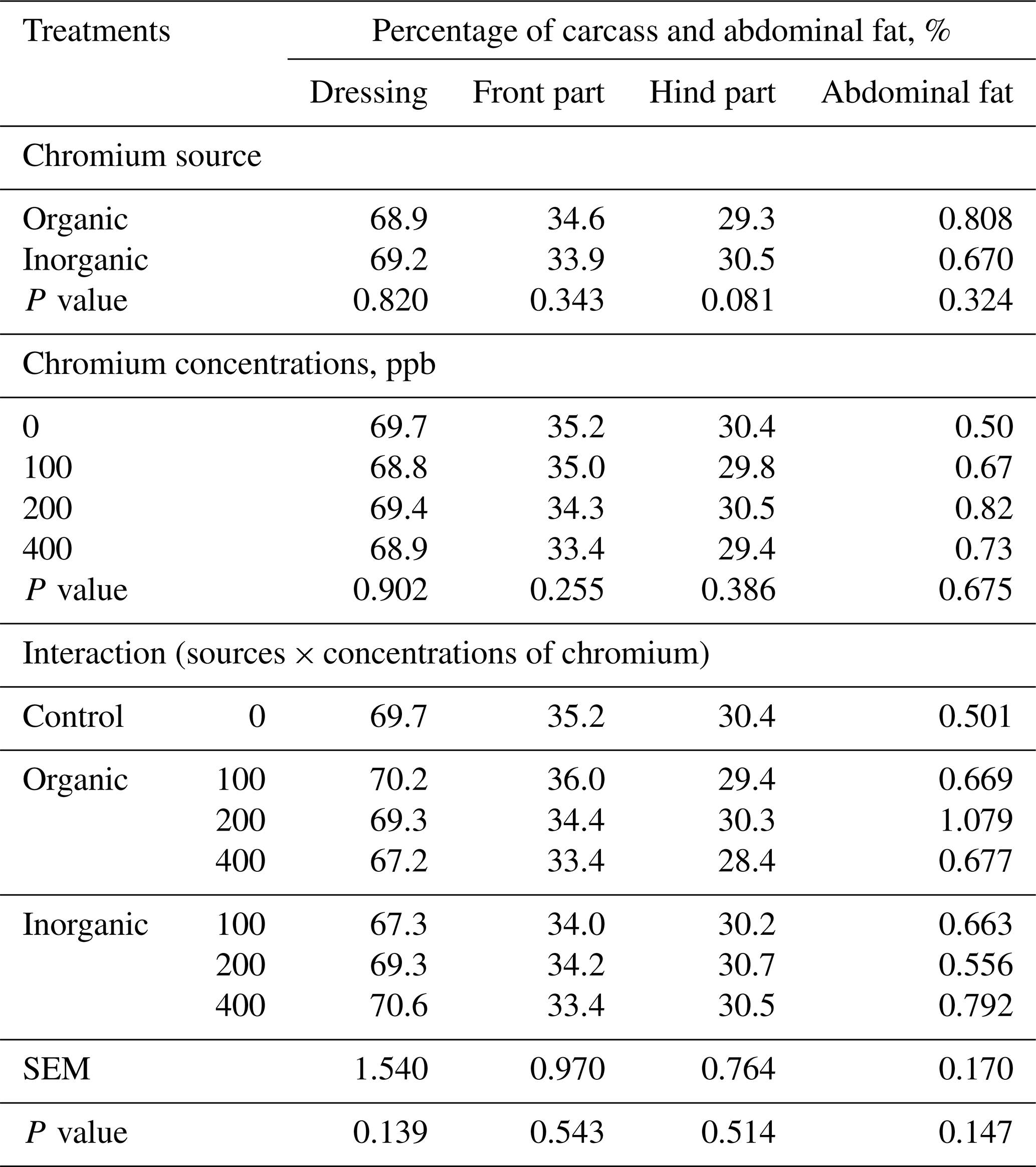 Table 4LS means of percentage of carcass and abdominal fat of broilers at 42 d of age fed diets with different sources and concentrations of chromium supplementation (n=8 broilers (replicates) per treatment.