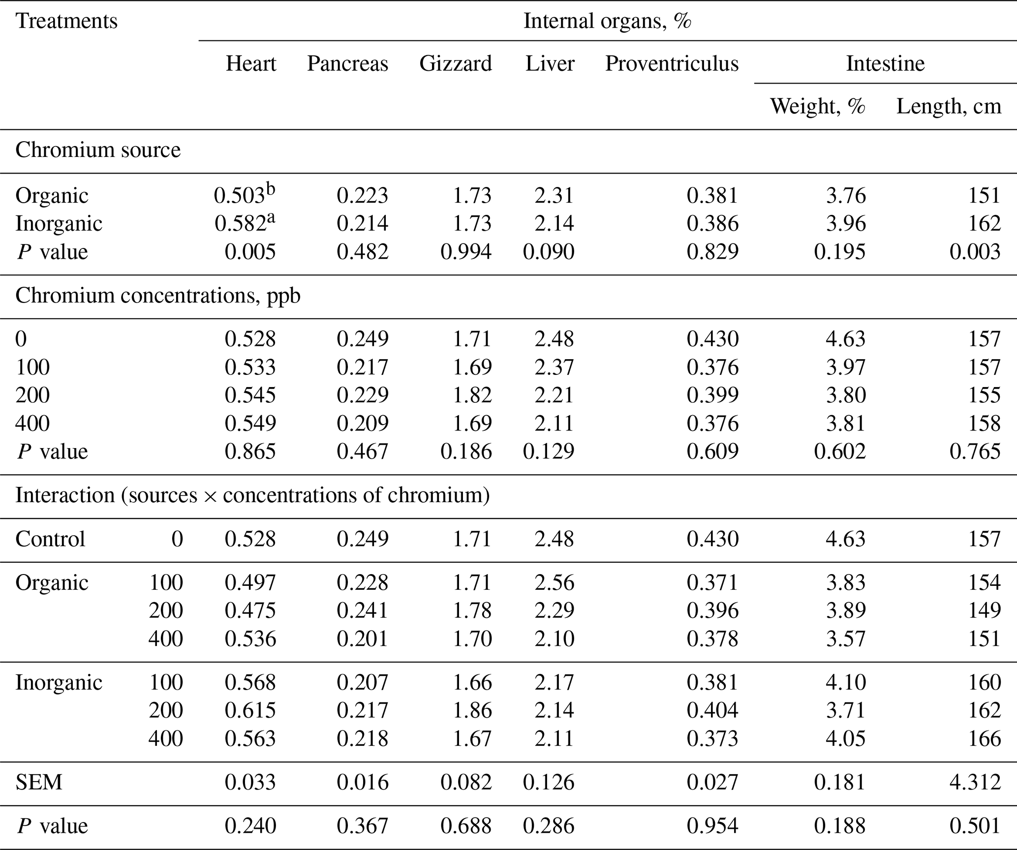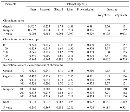 Table 5LS means of internal organs in broilers at 42 d of age fed diets containing different supplementations chromium sources and concentrations (n=8 broilers (replicates) per treatment).