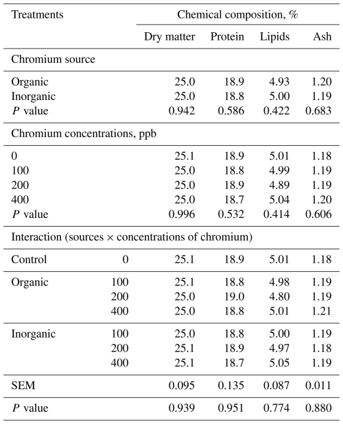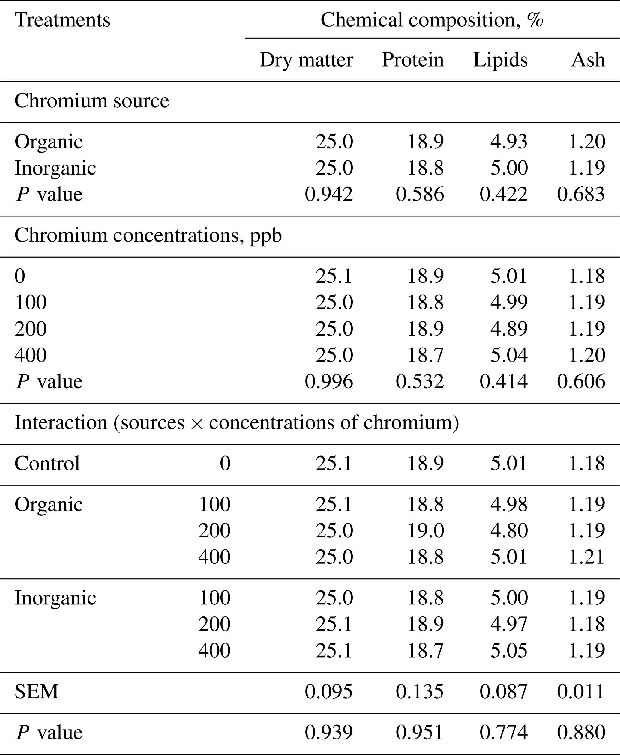 Table 6LS means of meat chemical composition of 42 d old broiler chickens fed diets with different supplementations chromium sources and concentrations, on a fresh-weight basis (n=8 broilers (replicates) per treatment).
