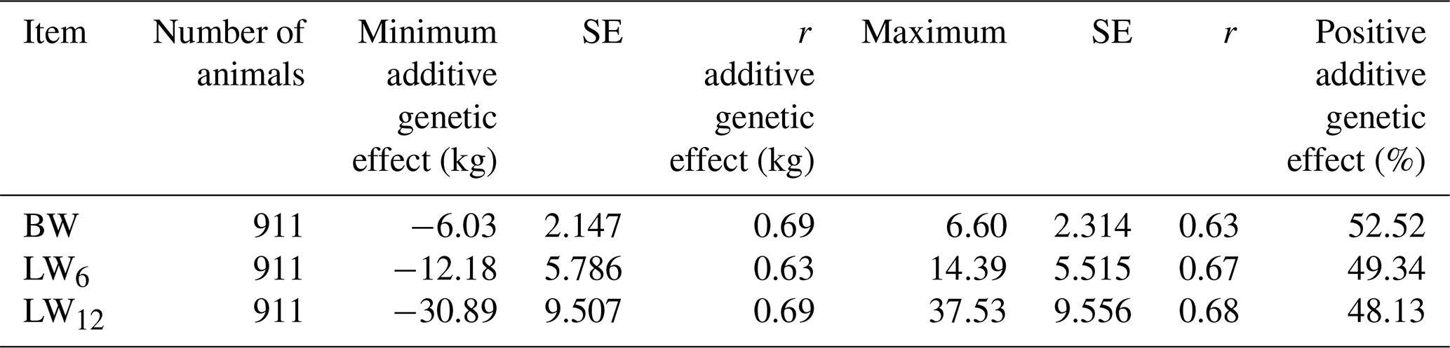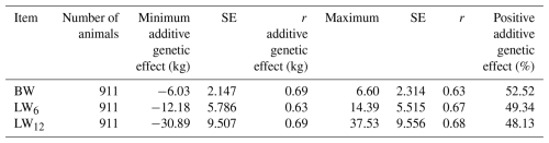 Table 3Minimum and maximum additive genetic effect, their standard error (SE), and accuracies of predictions (r) for BW, LW6, and LW12.