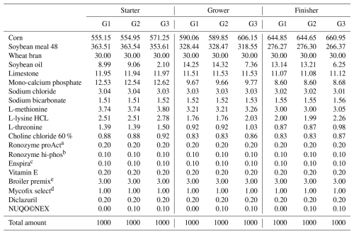 Table 2Composition of experimental diets expressed on an as-fed basis (g kg−1).