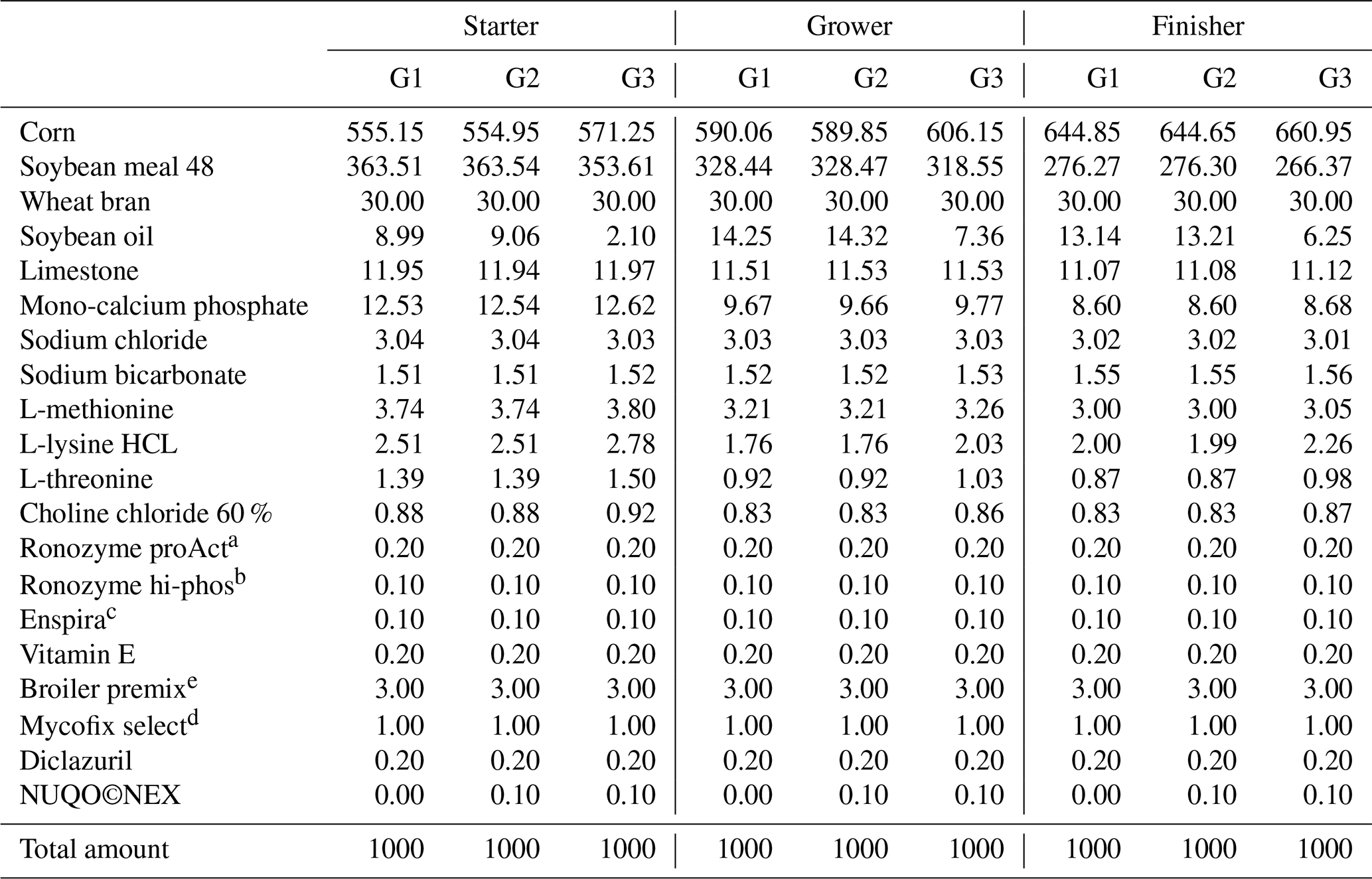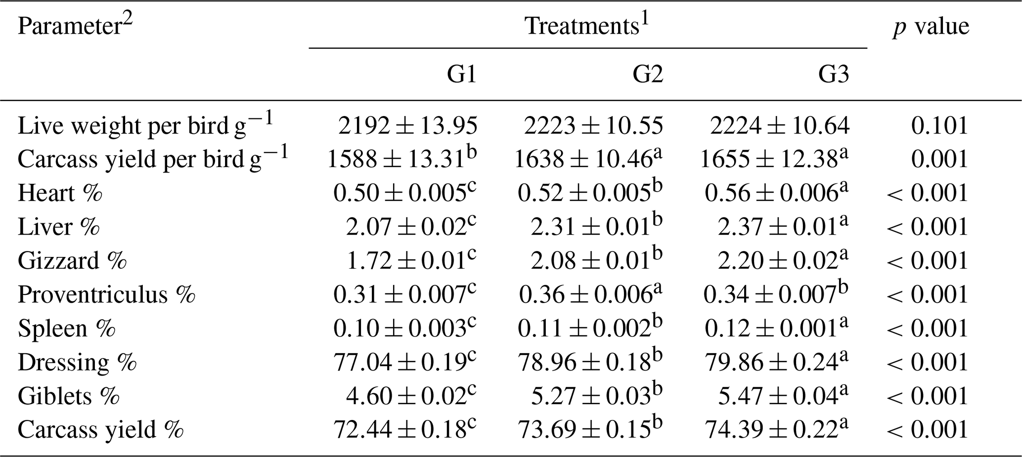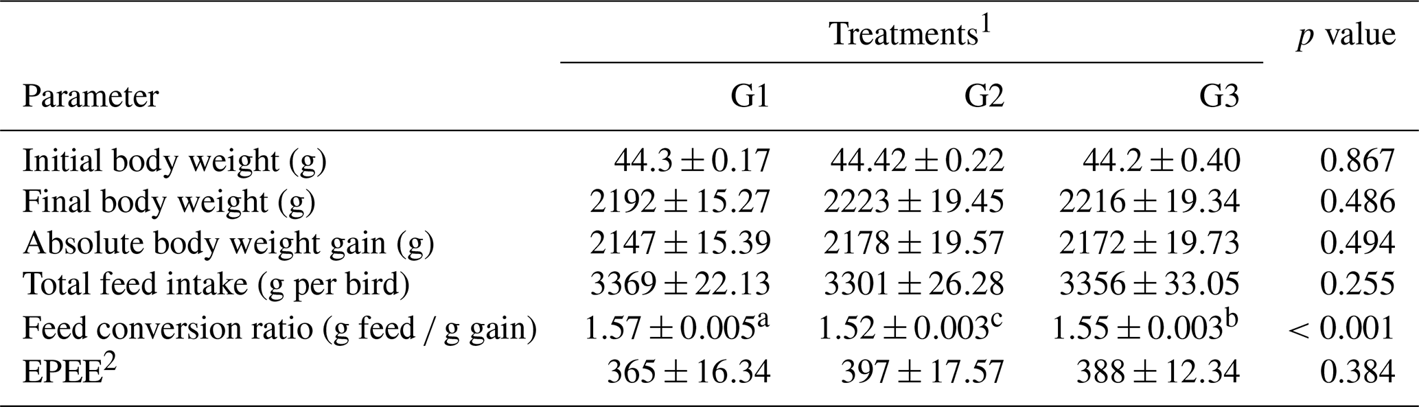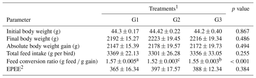 a–c Means within the rows carrying different superscripts are significantly different at p<0.05. 1 Treatments: G1 – control diet (no additives added); G2 – control diet +100 mg NUQO©NEX (biostimulants) kg−1 diet (on top); G3: control diet +100 mg NUQO©NEX (biostimulants) kg−1 diet (matrix value reducing nutrient requirement by 0.3 % crude protein and 30 Kcal metabolizable energy). 2 EPEF: European production efficiency factor.