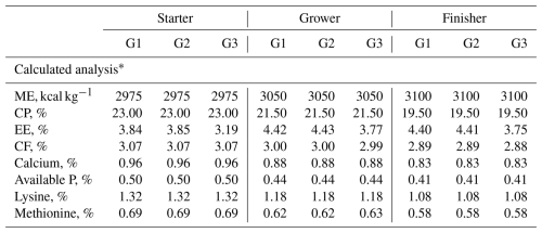 The experiment was extended for 35 d, and the feeding period was divided into three phases: the starter phase from 0 to 10 d, in which the birds were fed a diet containing 23 % CP and ME (2975 kcal kg−1 diet), the grower phase from 11 to 24 d, in which the birds were fed a diet containing 21.5 % CP and ME (3050 kcal kg−1 diet), and the finisher phase from 25 to 35 d, in which the birds were fed a diet containing 19.5 % CP and ME (3100 kcal kg−1 diet) (Tables 1 and 2). The experimental diets and feedstuffs were examined for ether extract, moisture, and crude protein in accordance with the AOAC's (2002) standard operating procedures.