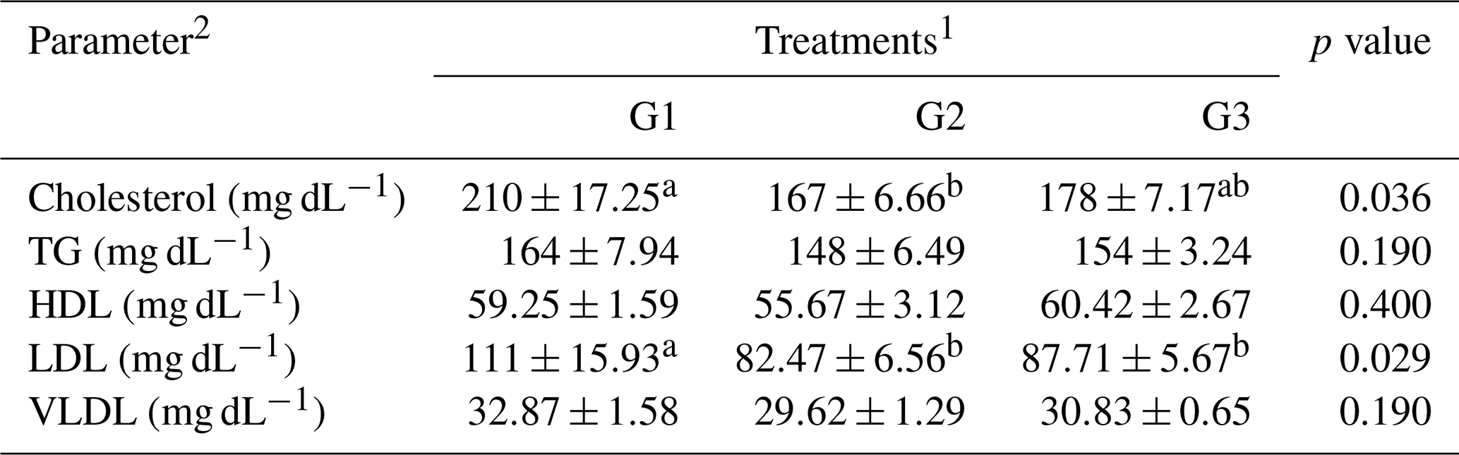 ab Means within the rows carrying different superscripts are significantly different at P<0.05. 1 Treatments: G1 – control diet (no additives added); G2 – control diet + 100 mg NUQO©NEX (biostimulants) kg−1 diet (on top); G3 – control diet + 100 mg NUQO©NEX (biostimulants) kg−1 diet (matrix value reducing nutrient requirement by 0.3 % crude protein and 30 Kcal metabolizable energy). 2 TG: triglyceride, HDL: high-density lipoprotein, LDL: low-density lipoprotein, VLDL: very-low-density lipoprotein