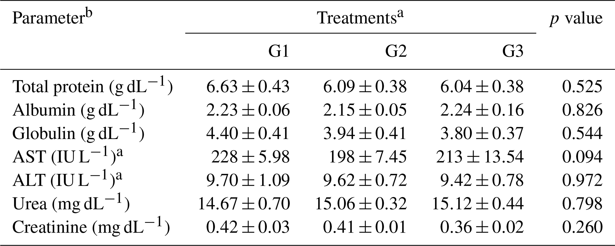 Means within the rows carrying different superscripts are significantly different at P<0.05. a Treatments: G1 – control diet (no additives added); G2 – control diet + 100 mg NUQO©NEX (biostimulants) kg−1 diet (on top); G3: control diet + 100 mg NUQO©NEX (biostimulants) kg−1 diet (matrix value reducing nutrient requirement by 0.3 % crude protein and 30 Kcal metabolizable energy). b AST: aspartate-aminotransferase, ALT: alanine-aminotransferase
