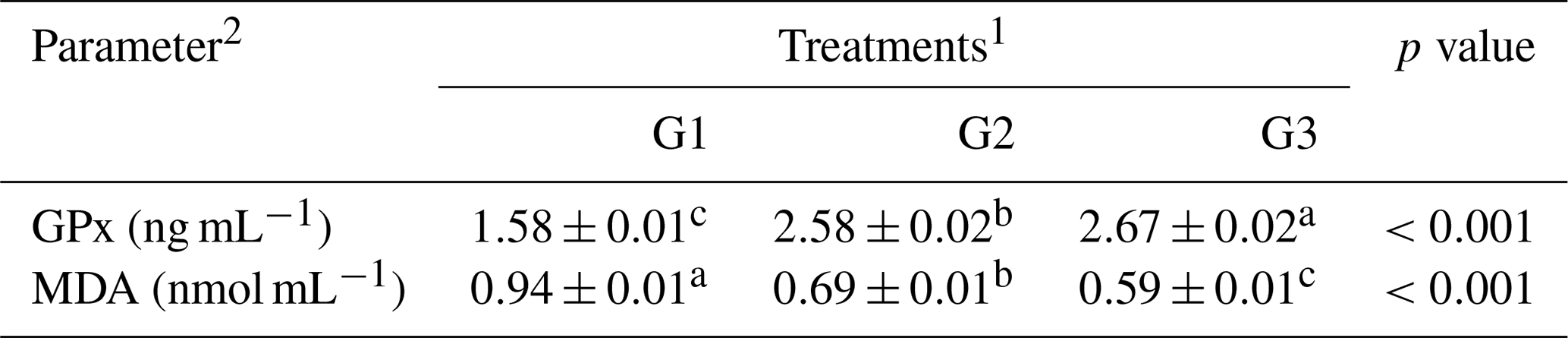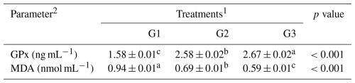 a–c Means within the rows carrying different superscripts are significantly different at P<0.05. 1 Treatments: G1 – control diet (no additives added); G2 – control diet + 100 mg NUQO©NEX (biostimulants) kg−1 diet (on top); G3 – control diet + 100 mg NUQO©NEX (biostimulants) kg−1 diet (matrix value reducing nutrient requirement by 0.3 % crude protein and 30 Kcal metabolizable energy). 2 GPx: glutathione peroxidase, MDA: Gaweł et al. (2004).