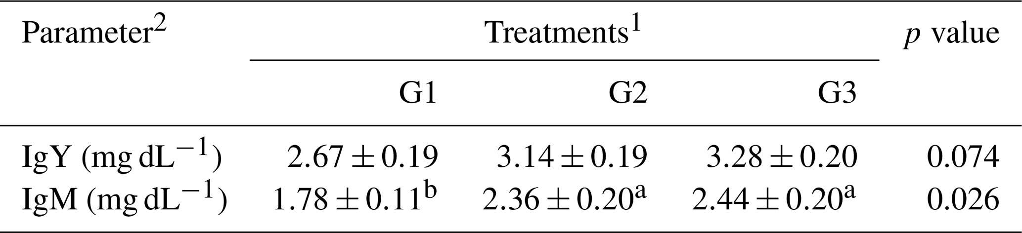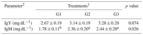 a,b Means within the rows carrying different superscripts are significantly different at P<0.05. 1 Treatments: G1 – control diet (no additives added); G2 – control diet + 100 mg NUQO©NEX (biostimulants) kg−1 diet (on top); G3 – control diet + 100 mg NUQO©NEX (biostimulants) kg−1 diet (matrix value reducing requirement reduced by 0.3 % crude protein and 30 Kcal metabolizable energy). 2 IgY and IgM: immunoglobulins