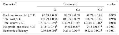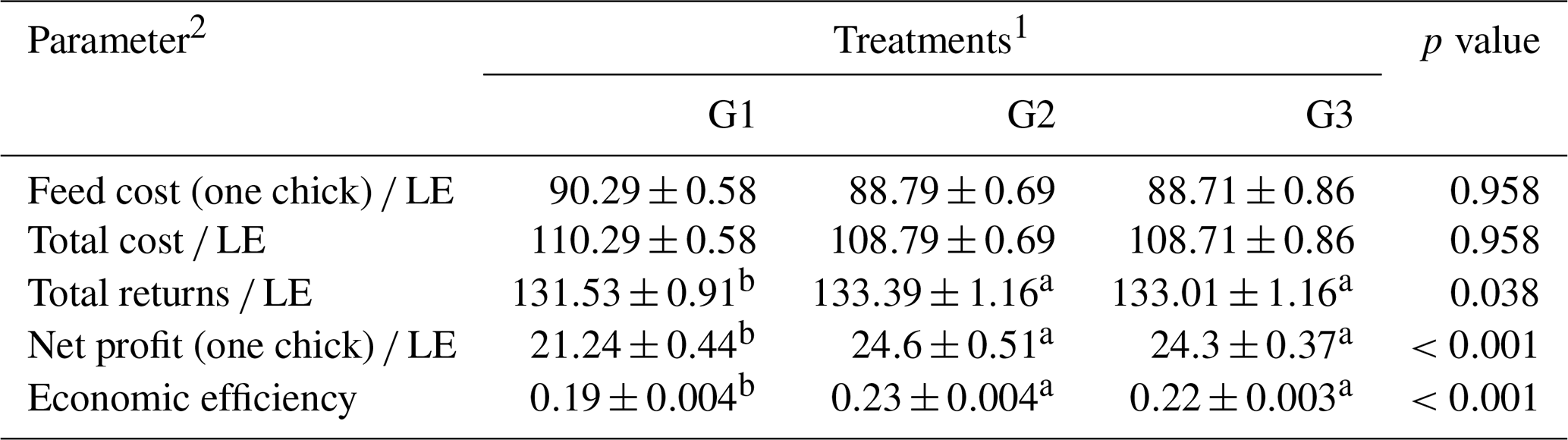 Cost parameters were categorized using the techniques of Ahmed (2007). The first parameter was total fixed costs (TFCs): in this state, each chick took up equal costs in terms of litter, labour, purchased chicks, water, electrolyte, veterinary medicaments (drugs, vaccine and veterinary supervision), equipment depreciation, and building, and so these factors were considered to be fixed expenses for each group. Next were the total variable costs (TVCs), covering the expense of feed and feed additives (Hassan, 2009). This was calculated during the experiment. Total costs (TCs) were calculated when the entirety of the fixed expenses and variable costs were added up. Total returns (TRs) from chick sales were calculated as body weight × kg price. Net profit was calculated as total returns − total costs. Economic efficiency was calculated as net profit total cost.